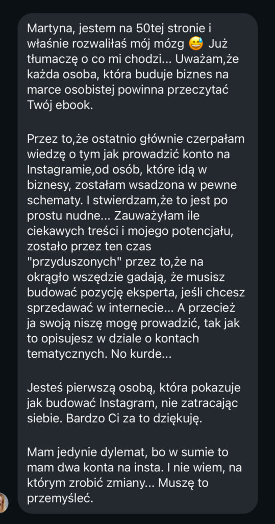 ✅ prowadzisz konto lifestylowe lub tematyczne i próbujesz wcielać w życie wskazówki instaspecjalistów od budowania marki osobistej i biznesu, ale nijak nie przekłada się to na Twoje konto, bo nie prowadzisz biznesu.